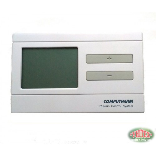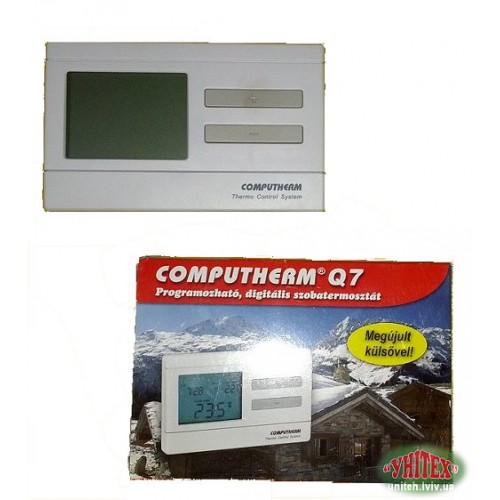 Кімнатний термостат COMPUTHERM Q7 простий в підключенні і дає можливість керувати будь-яким газовим або електричним котлом і системою кондиціонування, які під'єднуються за допомогою двожильного кабелю, незалежно від керуючої напруги - 24V або 230V.Для кожного дня тижня може бути встановлена окрема температурна програма. Днем можуть бути обрані 6 різних часів включення (з кроком в 10 хв.), І для кожного з часу налаштований різний градус нагрівання / охолодження з кроком 0.5 º-С.Чувствітельность включення термостата може бути обрана між ± 0.2 º-С (заводська настройка рекомендована для радіаторного опалення) і +0 / -2 º-С (налагодження рекомендована для підлогового опалення). Під цим значенням потрібно розуміти температурну різницю між налаштованою і реально виміряної температурой.Термостат має функцію захисту циркуляційного насоса: Якщо в продовженні 24 годин немає необхідності включення котла по заданій йому програмі, то кімнатний термостат щодня дасть сигнал для включення котла один раз на добу в 12год . 00мін.